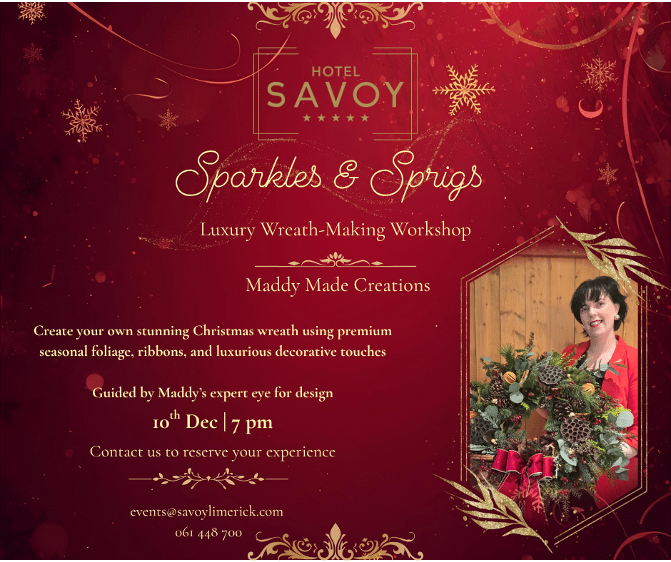 Get into the Christmas spirit with a luxurious Wreath Making Class hosted by Maddy Made Creations in the opulent surroundings of The Savoy Hotel, Limerick.