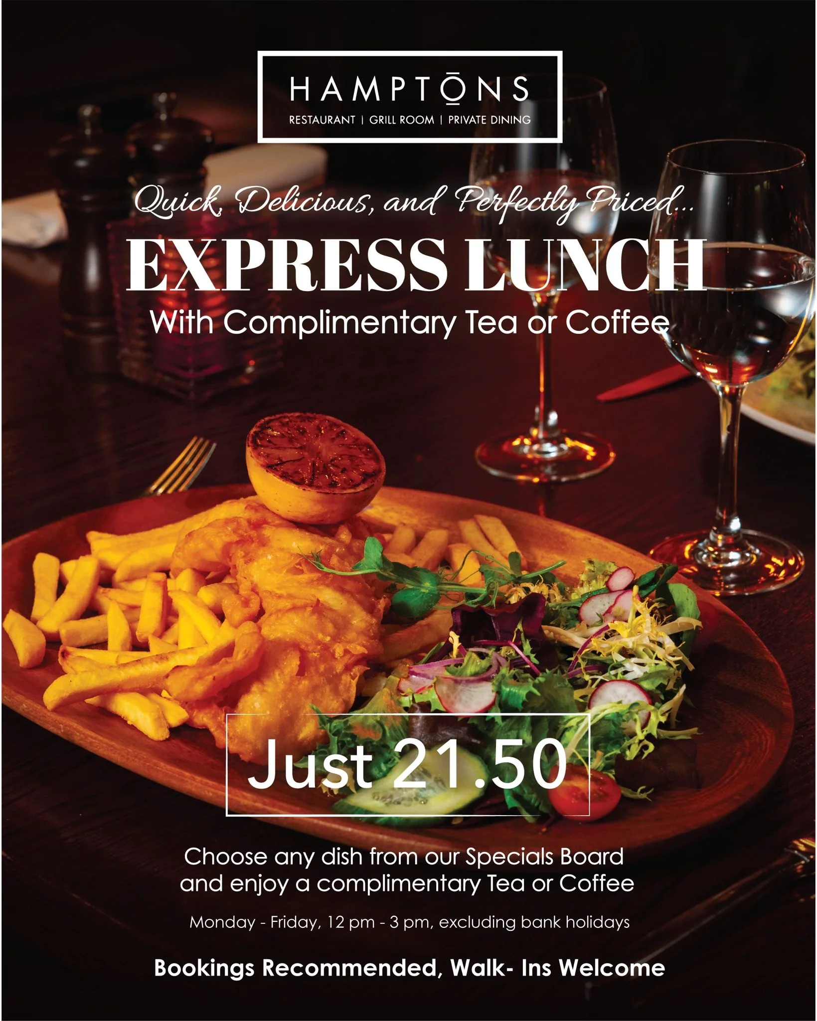 Hamptons – Lunch Done Your Way While staying with us, take a break from your day and enjoy the vibrant flavours of Hamptons, our New York–style grill restaurant. Whether you have time to enjoy a full 2- or 3-course lunch or you’re in a hurry and need something quick before hitting the road, our Express Lunch is the perfect choice.