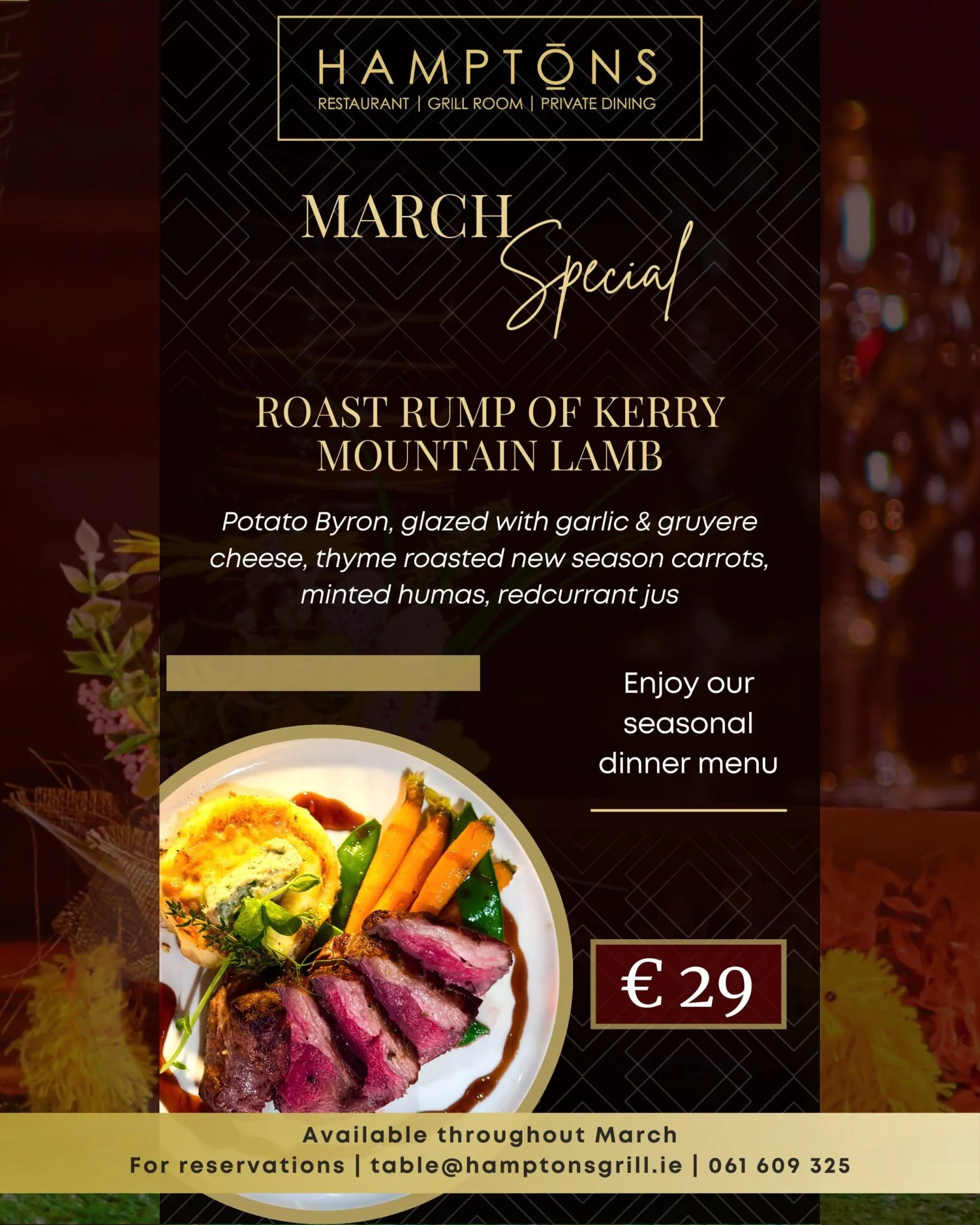+353 (0) 616 09 325 or table@hamptonsgrill.ie